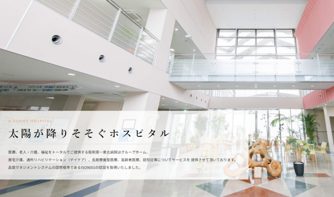 『阪和第一泉北病院』は、1024床を備える医療療養型のリゾートホスピタルです。泉北ニュータウンのほぼ中央の高台に位置し、風光明媚な医療環境のもと長期療養を目指す患者様を第一に考えた療養環境と質の高いサービスを提供しております。院内には通所リハビリセンターや居宅支援センターなど多様な利用者様に対応した医療・介護を提供しております。