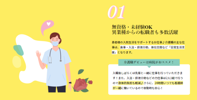 給与水準も他の病院よりも高く設定しており、残業もほぼありませんので仕事とプライベートの両立もしやすいかと思います。指導体制も整っており、これから介護職・看護助手としてキャリアをスタートさせたい方には気に入っていただる環境なのではないかと思います。