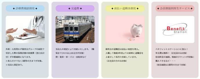 A.「社宅あり」「保育所完備」「退職金制度」など様々な福利厚生があります。